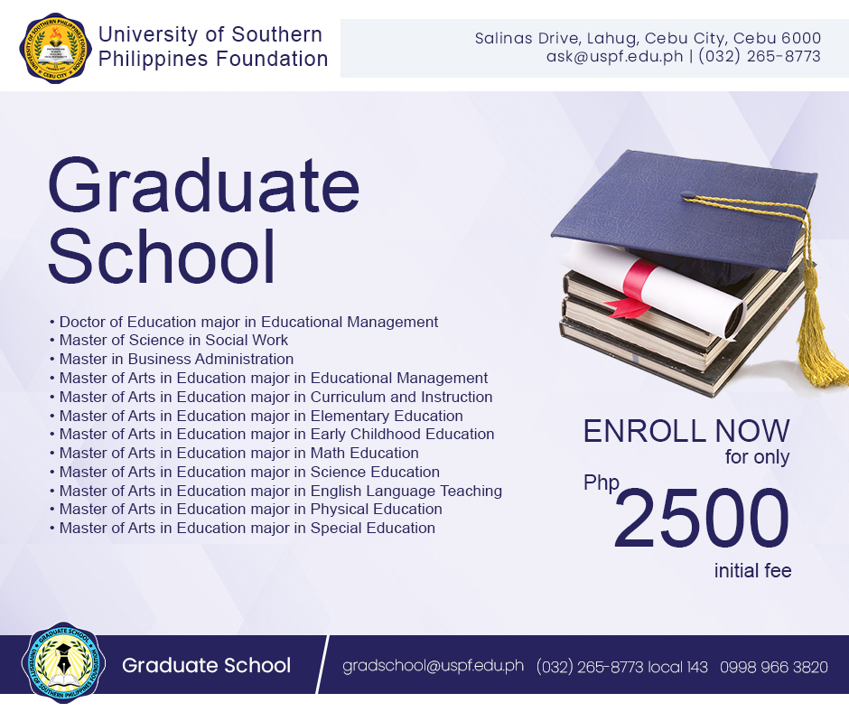 The Graduate School of the University of Southern Philippines offers graduate programs in education, social work, and business. The graduate programs provide professionals opportunities for advancement in their careers and focus on application of knowledge and skills through courses involving dynamic and interactive discussions, projects, collaborative group work, independent study, and individual and group research. Our graduate courses allow professionals to improve their practice and extend their expertise and skills relating to current issues, trends, and developments in their respective fields.